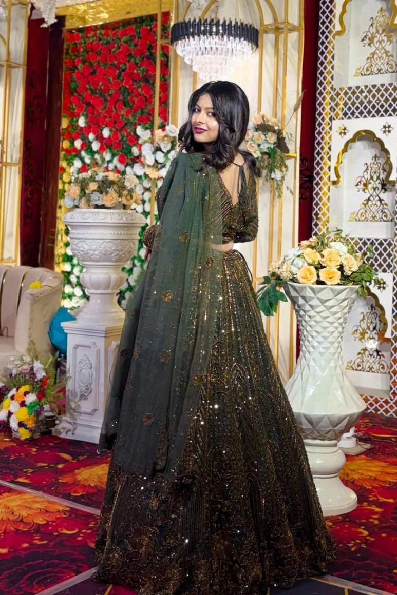 A shimmering reception lehenga adorned with dazzling sequins and intricate beadwork, designed to make you the star of your grand celebration.